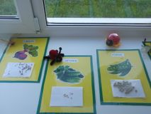 Пособие состоит из карточек, на которых изображены плоды и их семена. Для первого знакомства наших исследователей с семенами были выбраны самые популярные культуры, такие как помидор, огурец, свёкла, морковь, горох.