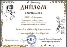 К 221-летию со дня рождения А.С. Пушкина Мастерская праздников "KARJALA" организовала всероссийский творческий фестиваль-конкурс «Любовь к творчеству великого поэта А. С. Пушкина». Нашу школу представляли Елизавета Говердовская (классный руководитель О.С. Яшшиева) и обучающиеся 4 «А» класса (классный руководитель Е.С. Федулова, учитель-логопед Н.Г. Спиридонова).