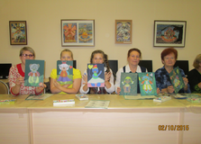 После выставки Маргарита Юфа провела мастер-класс «Рисование пастелью». Учителя окунулись в мир детства и беззаботности, они рисовали и шутили. В итоге, у всех получились милые рисунки куколок и мишек, которые 5 октября красовались на выставке, организованной в фойе школы.