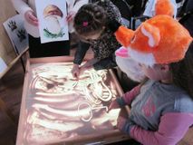 На станции «Рисовалочка» ребятам было предложено нарисовать следы зверей и елочку из песка. Работы получились просто замечательные!